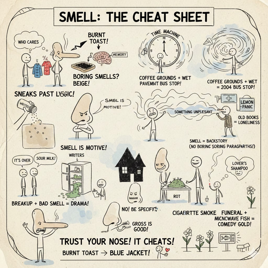 Try this exercise. Write a scene twice. First pass, ban smell. Second pass, cut three visual details and replace them with one olfactory one. Not perfume ads. Real stuff. Burnt oil. Cheap soap. Damp cardboard. Notice how the emotional temperature shifts without you pushing it.